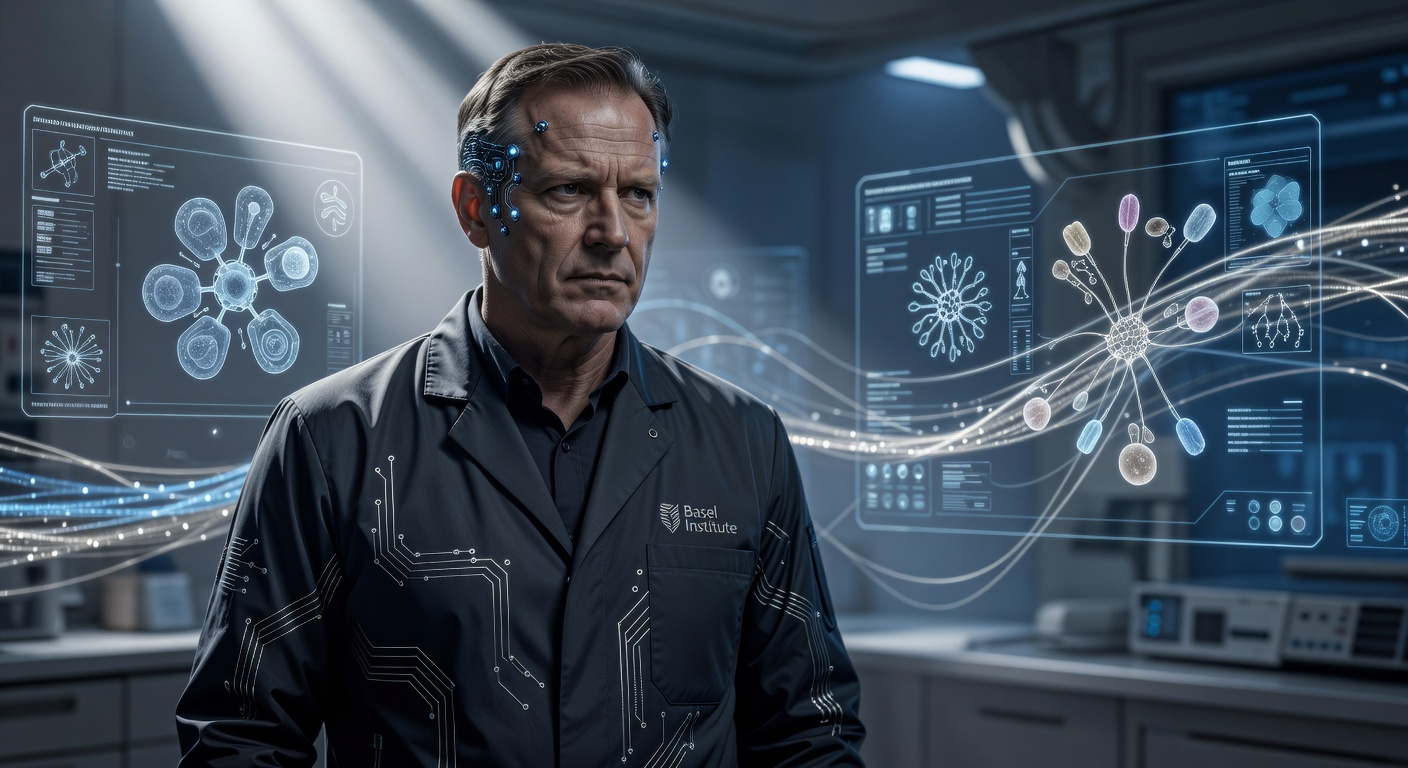 Computational immunology PhD at Heidelberg, postdoc at the Sanger Institute, faculty at Basel for twelve years. Has run multi-institutional consortia before — the political problems are familiar. The new element is that some of the consortium members are not human. His team uses a Hypothesis-Synthesis-Critique assembly — five specialized AI agents — that has been running continuously for nine months and has produced three papers and one bioRxiv preprint he's not sure he can fully explain.